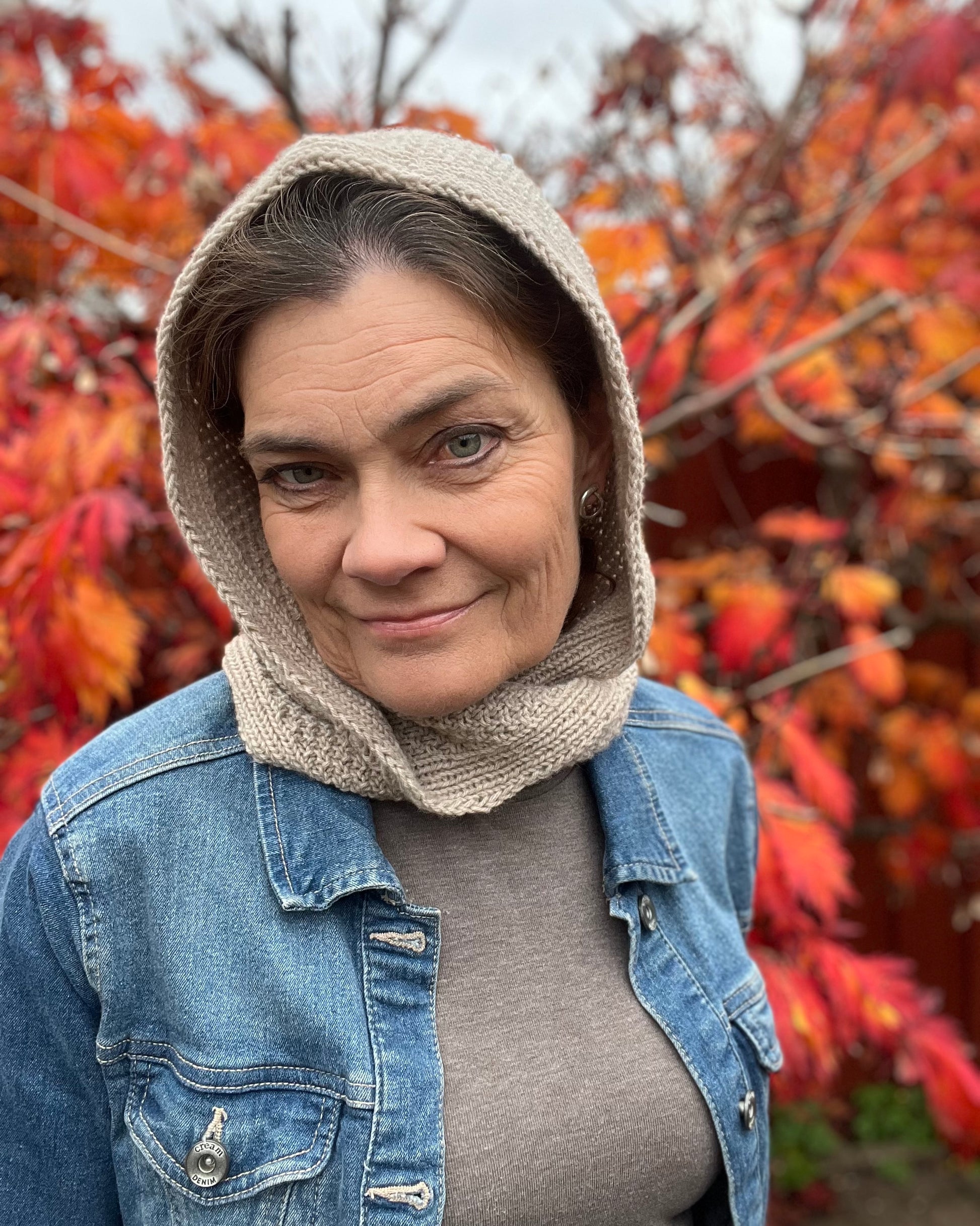 dobbeltperlestrik og med ribkanter i begge sider. Hætten formes med ind- og