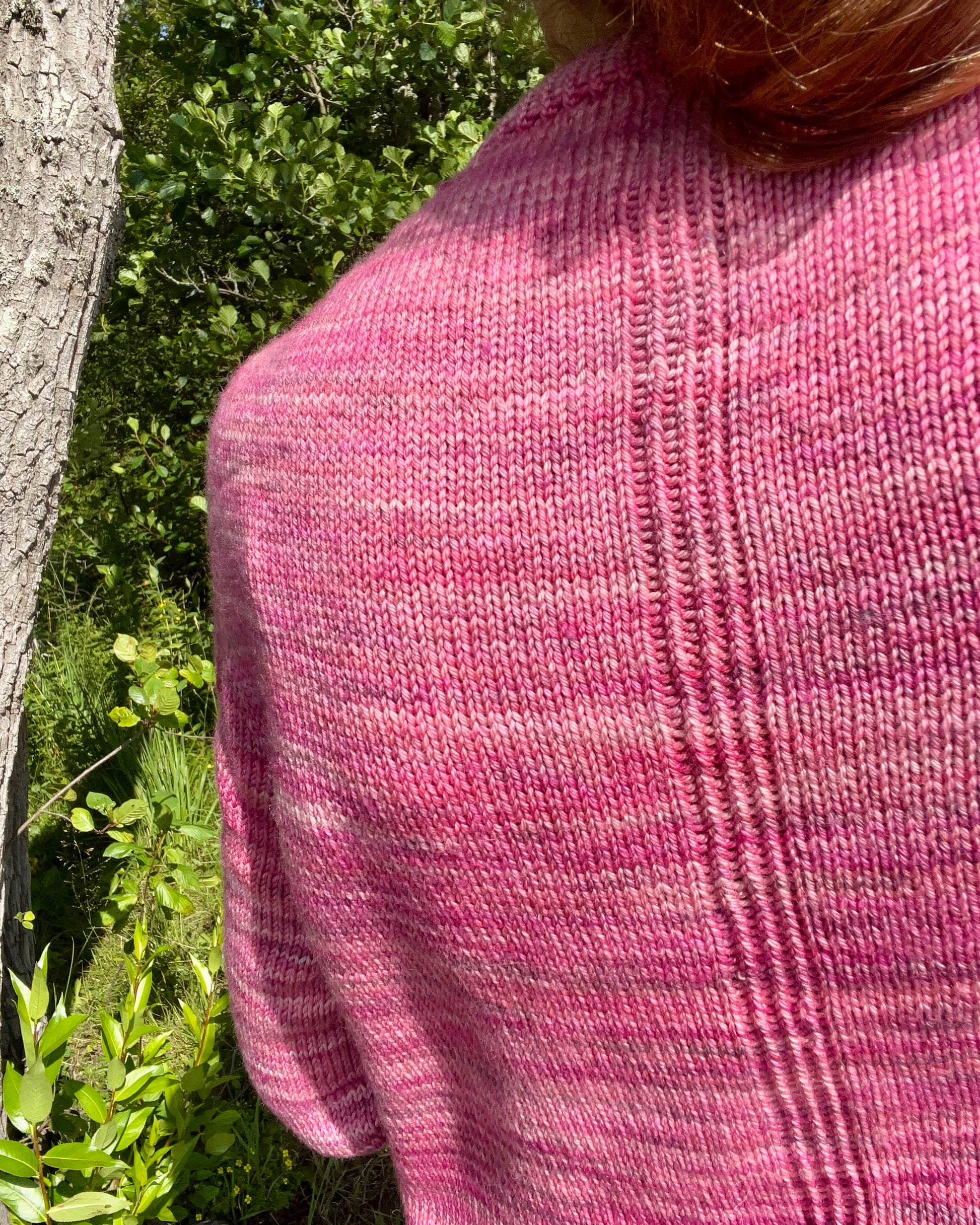 Modellen strikkes oppefra og ned, hvilket gør det nemt at justere længden på både krop og ærmer undervejs. Sweateren har en smuk sadelskulderkonstruktion, som formes med en kombination af skulder-, ærme- og raglanudtagninger.
